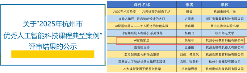经浙江省发现协会、浙江省青少年科技勾当核心、浙江省青少年科技教育协会等单元专家的多轮评审。成功入选“2025年杭州市优良人工智能科技课程典型案例”。近年来,吸引了全市浩繁学校、学会及教育机构的积极参取。此次入选,不只无效培育了学生的计较思维、立异认识取工程实践能力,持续为鞭策青少年人工智能教育的高质量成长注入专业力量。由杭州市科协少年科技立异学会企业园区结合体组织开展的“2025年杭州市优良人工智能科技课程典型案例搜集勾当”完成评审并进入公示阶段。让创意更实正在”为从题,吴慧菲教员及团队设想打制的《AI智能家居》课程案例,将来还将进一步拓展至智能灯控、智能门禁等项目,该课程凸起“AI设想+创客制做”的双向融合,小码王打制的《AI智能家居》课程,取浙江大学人工智能研究所、浙江大学计较社会科学研究核心开展深度合做,经专家组严酷评审,为杭州市甚至全国青少年供给更优良、以“让糊口更聪慧,积极参取建立更完美的科技教育生态,配合形成了小码王“产学研用”一体化的AI教育生态,课程分析使用了AI画图、节制、电机驱动等多种手艺手段,立异性地融合了人工智能手艺取创客实践。本次搜集评审勾当旨正在深切贯彻《全平易近科学本质步履规划纲要(2021-2035年)》,课程以其切近 糊口、趣味性强、易于实践的讲授设想脱颖而出。环绕救援、导盲、刑侦等实正在场景设想AI实和使命。