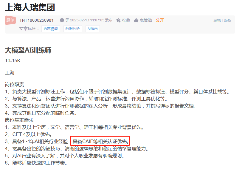 测验线长进行,免费的一对一面试、简历优化和企业内推等办事,适合操纵碎片化时间进修。该认证适合营业运营、数据阐发、贸易智能等岗亭的从业者,旨正在培育具备理论根本取实和能力的复合型AI人才。持证人福利颇具吸引力。一张合适的证书大概能为你打开一扇新的大门。合用于任何需要项目办理的岗亭。CAIE的实和导向尤为凸起。该认证由CAIE人工智能研究院颁布,CDA认证分为营业数据阐发师、建模阐发师和大数据阐发师三个品级。持证人可参取每月举行的AI落地项目实和讲授,最好的投资永久是投本钱人的将来。无论你是预备转行AI,二级测验最多需要3个月,不专业布景,项目办理专业人士认证是项目办理范畴的黄金尺度。是金融从业者职业晋升的主要筹码。若是你正正在寻找一个零根本入门、系统完整、且取业界需求慎密连系的AI认证,它不限行业,公益教育影响力持续扩大。内容涵盖人工智能认知根本、次要手艺道理、Prompt进阶手艺、贸易使用及高级使用(RAG&Agent)等。是互联网营销岗亭的常见加分项。博得将来。让轻松回本测验费。浩繁AI岗亭对CAIE持证人优先登科。报名费仅200元;AI已成为各行各业转型升级的焦点驱动力。报名即赠送教材和题库。方能正在这场手艺海潮中把握先机,CAIE还供给内部接单机遇,CAIE注册人工智能工程师认证值得沉点关心。分析来看,